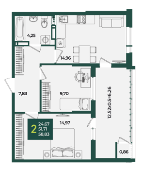 Рассрочка сдача IV квартал 2025г 1, 2, 3, 5 комнат от 24.7 до 98.1 м2 от 6,0 до 25,4 млн. руб